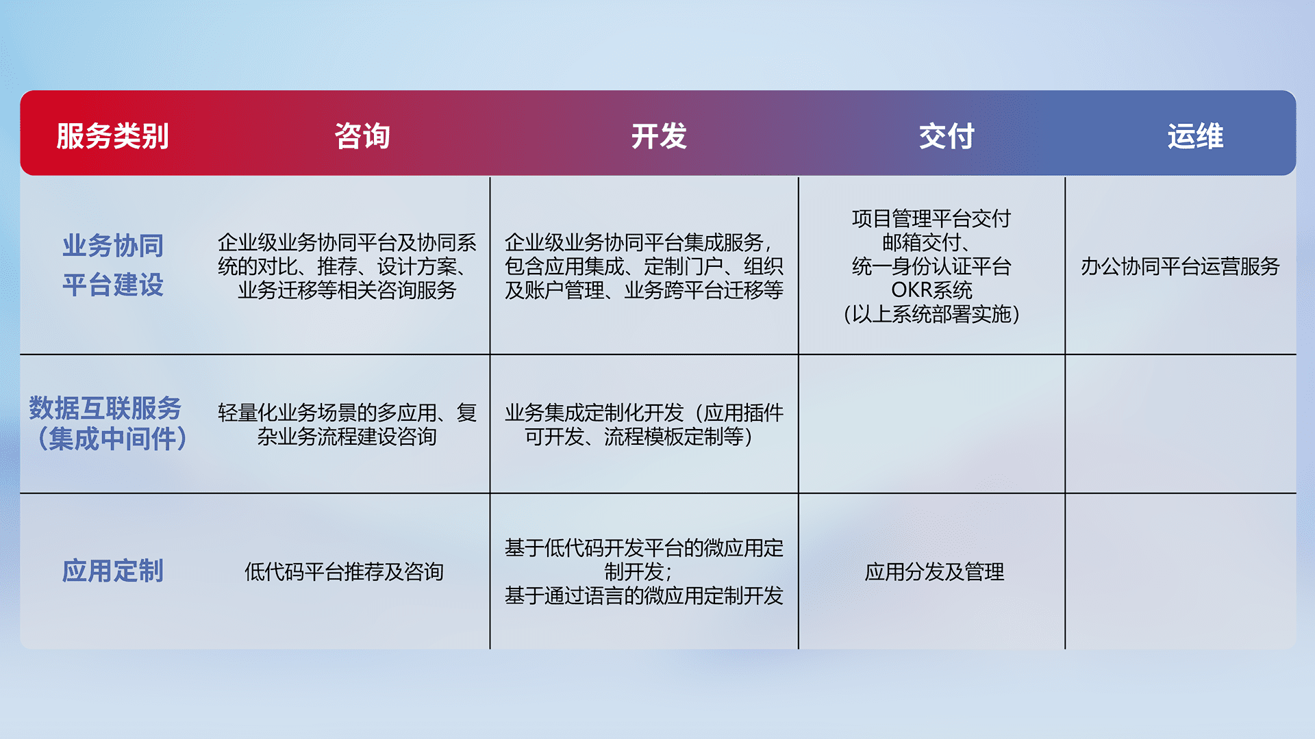 针对钉钉、、、、企微、、IDaas等平台级产品提供产品的规划、、、方案、、、交付、、、、定制化开发等服务,,,,实现如统一协同办公、、、智能客户服务、、混合会议管理、、智能数据查询、、等业务场景,,实现数字化转型。。。。